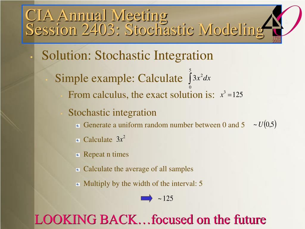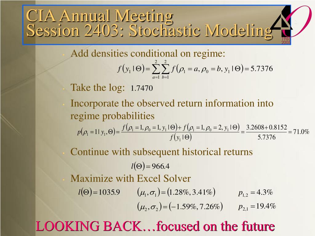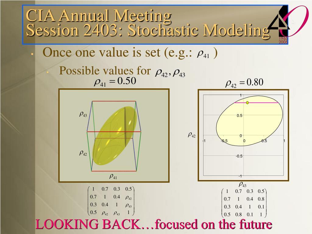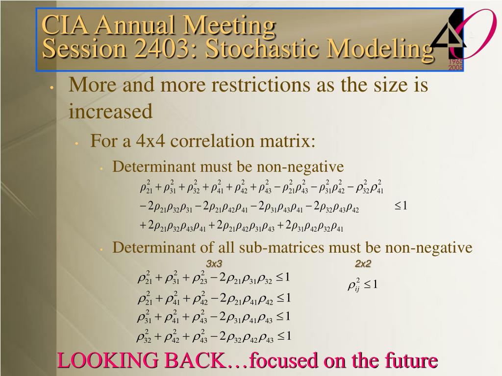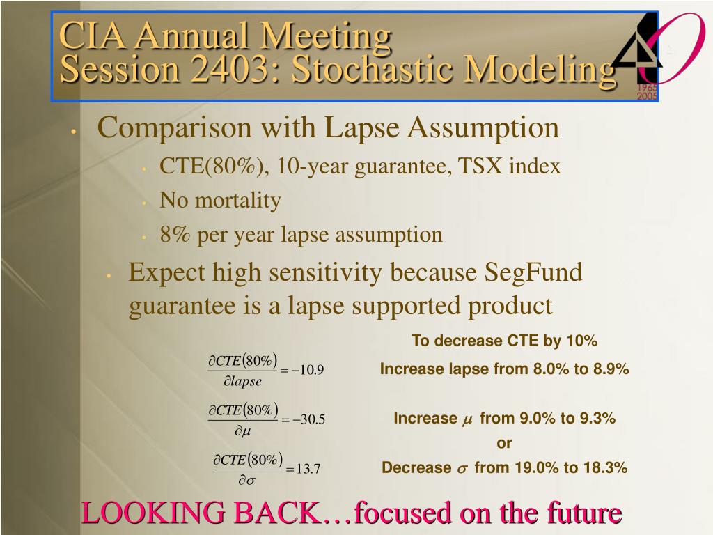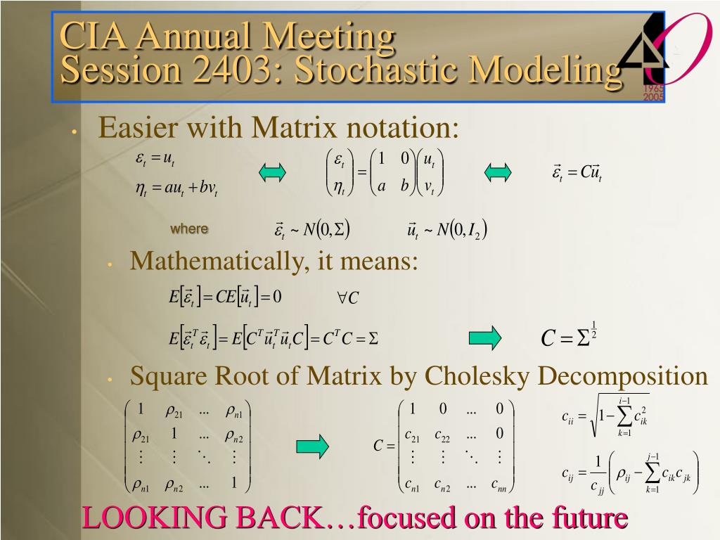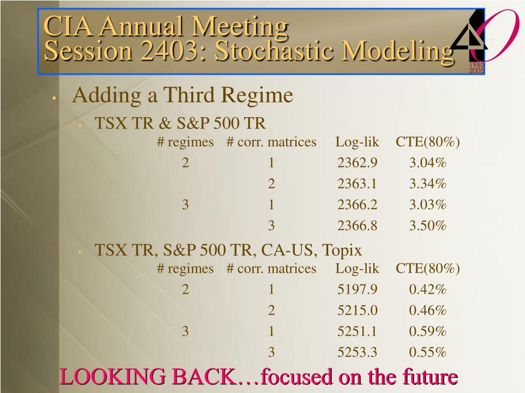 CIA Annual Meeting. LOOKING BACK…focused on the future. Christian-Marc Panneton e-mail: Christian-Marc.Panneton@inalco.com. Agenda Why we need Stochastic Modeling Importance of Parameters LN Model and Parameters Simulation - Correlation RSLN Model and Parameters Copulas.