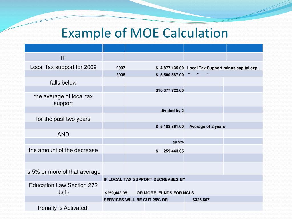 What is Maintenance of Effort (MOE) and Education Law Section 272 J.(1) Penalty? • A requirement contained in Education Law Section 272 J.(1) requiring that a specified level of local funding support be maintained • Education Law Section 272 J.(1) states that any library system that fails MOE will receive a 25% cut in State Aid