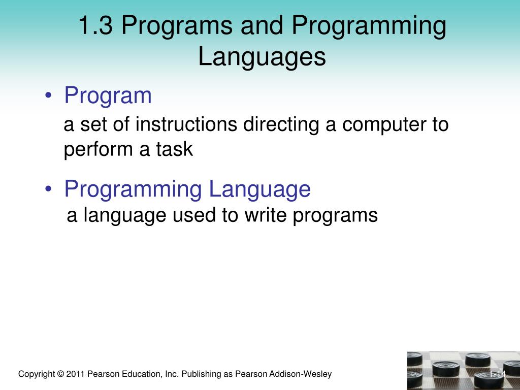 1.3 Programs and Programming Languages • Program a set of instructions directing a computer to perform a task • Programming Language a language used to write programs