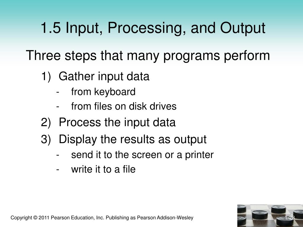 1.5 Input, Processing, and Output Three steps that many programs perform • Gather input data • from keyboard • from files on disk drives • Process the input data • Display the results as output • send it to the screen or a printer • write it to a file