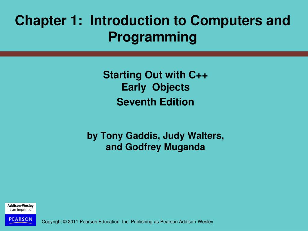 Chapter 1: Introduction to Computers and Programming. Starting Out with C++ Early Objects Seventh Edition by Tony Gaddis, Judy Walters, and Godfrey Muganda. Topics. 1.1 Why Program? 1.2 Computer Systems: Hardware and Software 1.3 Programs and Programming Languages