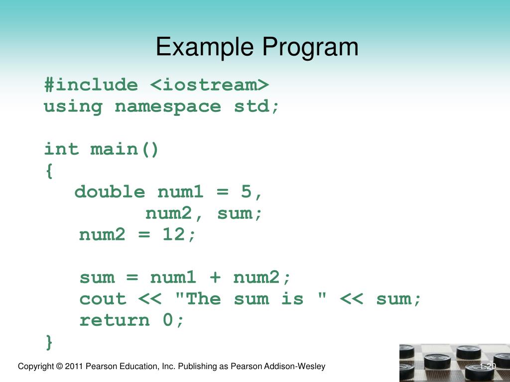 Example Program #include <iostream> using namespace std; int main() { double num1 = 5, num2, sum; num2 = 12; sum = num1 + num2; cout << "The sum is " << sum; return 0; }