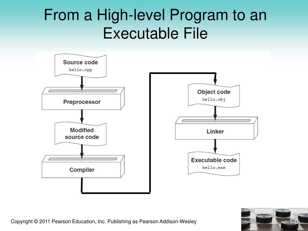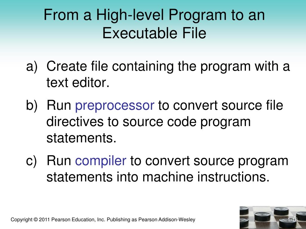 From a High-level Program to an Executable File • Create file containing the program with a text editor. • Run preprocessor to convert source file directives to source code program statements. • Run compiler to convert source program statements into machine instructions.