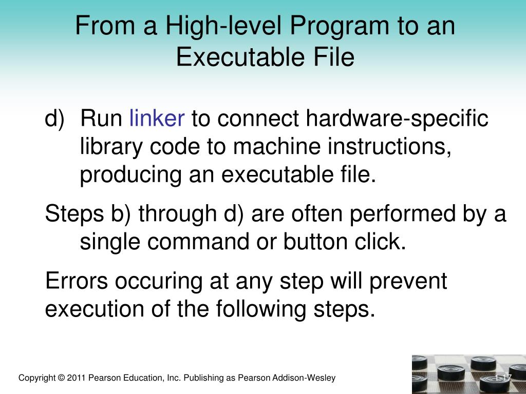 From a High-level Program to an Executable File • Run linker to connect hardware-specific library code to machine instructions, producing an executable file. Steps b) through d) are often performed by a single command or button click. Errors occuring at any step will prevent execution of the following steps.