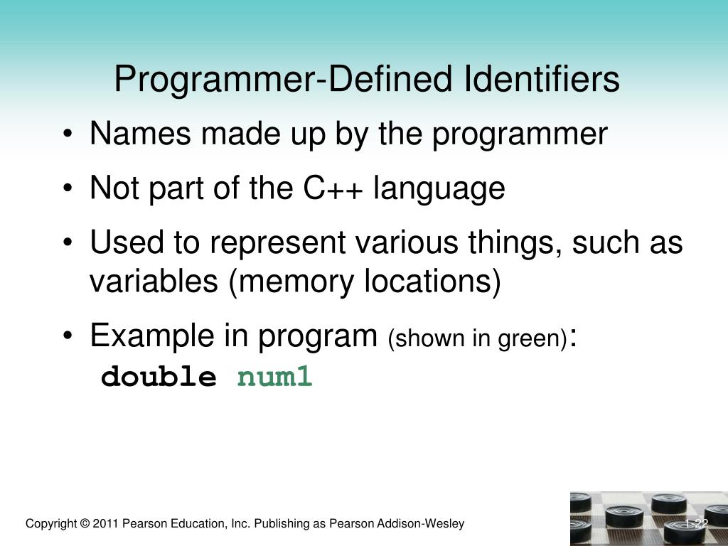 Programmer-Defined Identifiers • Names made up by the programmer • Not part of the C++ language • Used to represent various things, such as variables (memory locations) • Example in program (shown in green): double num1