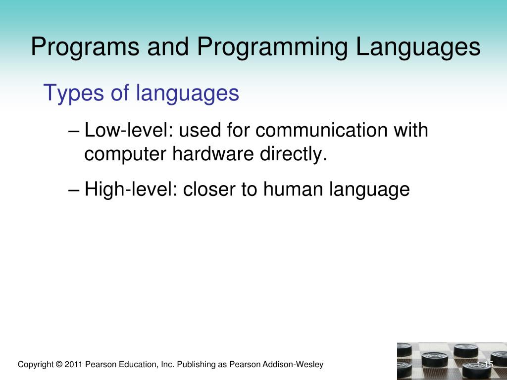 Programs and Programming Languages Types of languages • Low-level: used for communication with computer hardware directly. • High-level: closer to human language
