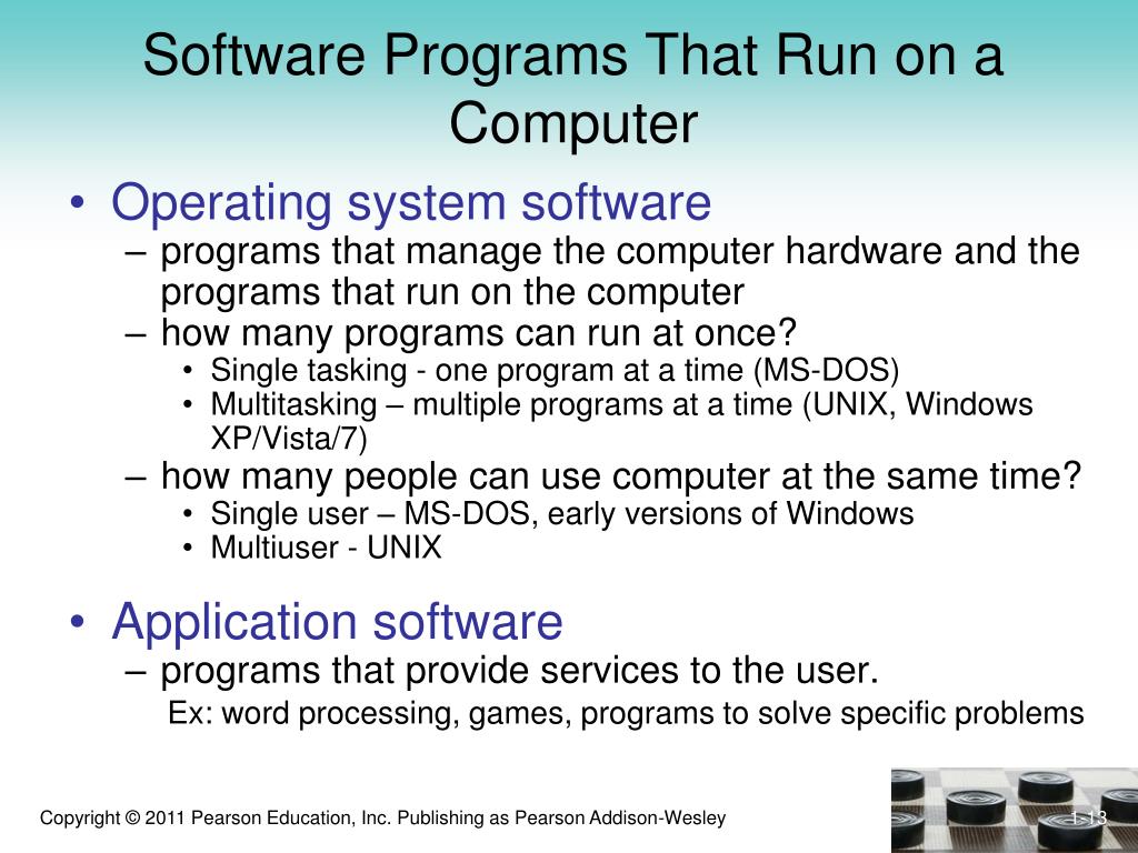 Software Programs That Run on a Computer • Operating system software • programs that manage the computer hardware and the programs that run on the computer • how many programs can run at once? • Single tasking - one program at a time (MS-DOS) • Multitasking – multiple programs at a time (UNIX, Windows XP/Vista/7) • how many people can use computer at the same time? • Single user – MS-DOS, early versions of Windows • Multiuser - UNIX • Application software • programs that provide services to the user. Ex: word processing, games, programs to solve specific problems