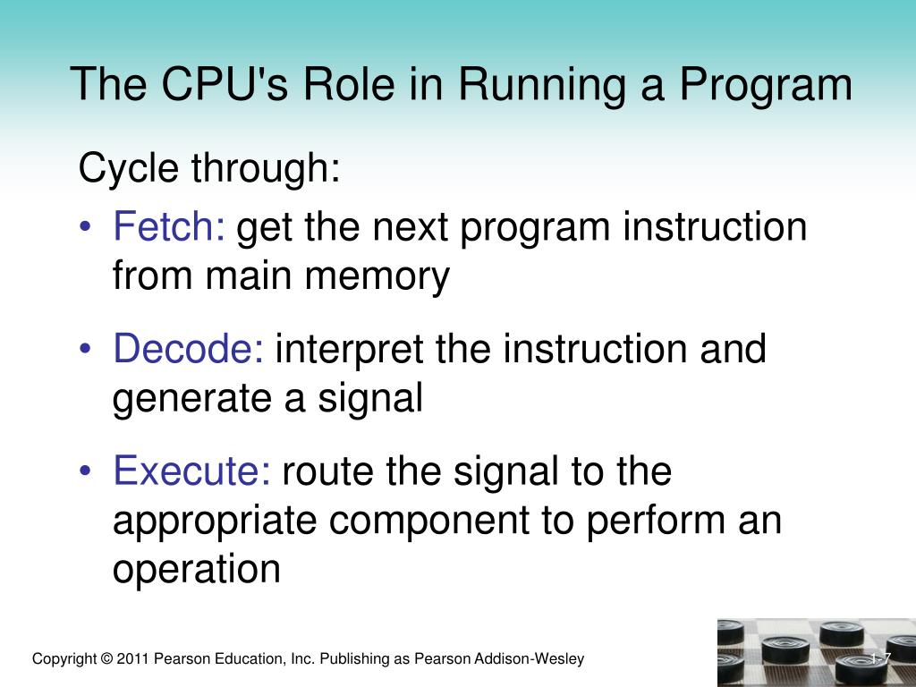 The CPU's Role in Running a Program Cycle through: • Fetch: get the next program instruction from main memory • Decode: interpret the instruction and generate a signal • Execute: route the signal to the appropriate component to perform an operation