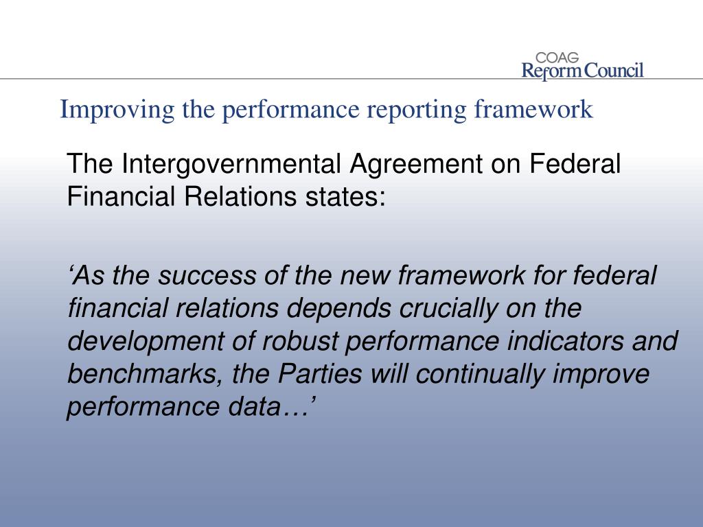 Improving the performance reporting framework The Intergovernmental Agreement on Federal Financial Relations states: ‘As the success of the new framework for federal financial relations depends crucially on the development of robust performance indicators and benchmarks, the Parties will continually improve performance data…’