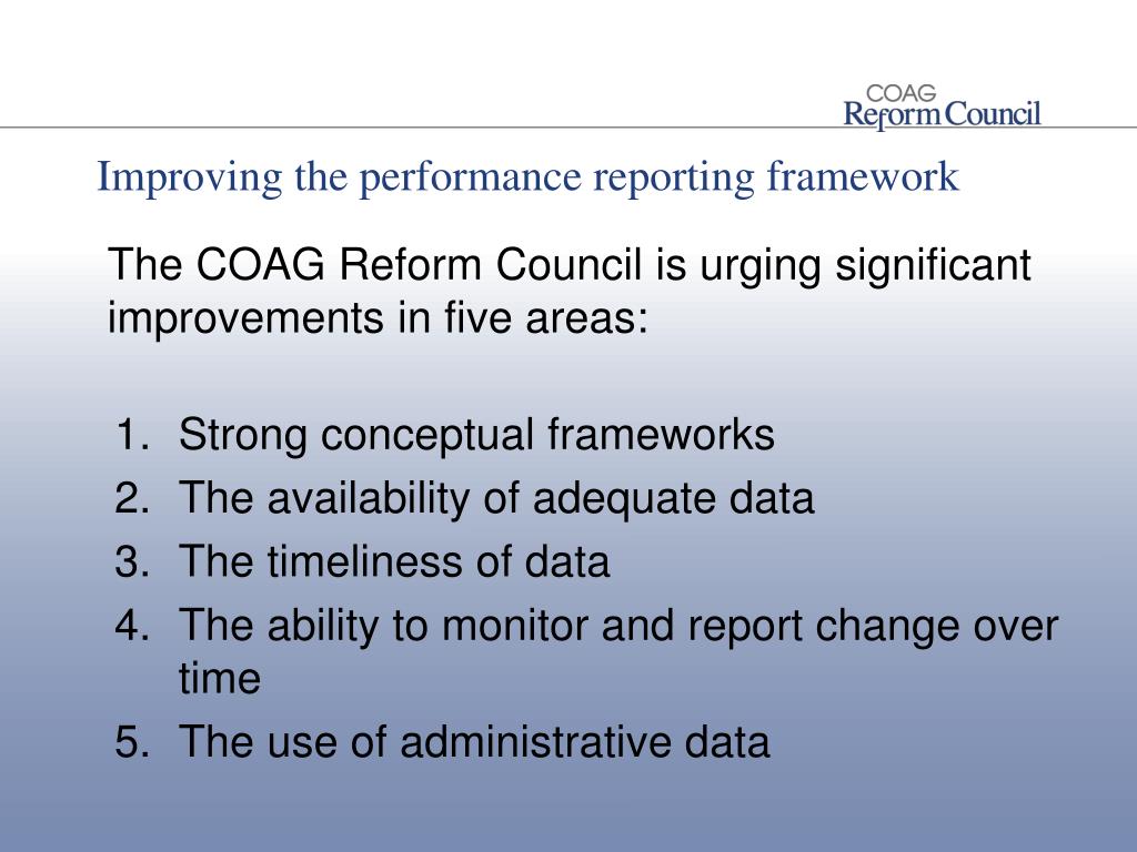 Improving the performance reporting framework The COAG Reform Council is urging significant improvements in five areas: • Strong conceptual frameworks • The availability of adequate data • The timeliness of data • The ability to monitor and report change over time • The use of administrative data
