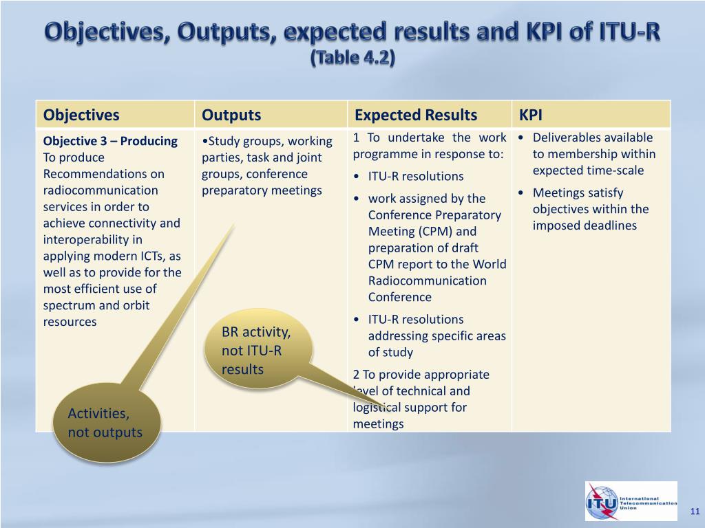 Objectives, Outputs, expected results and KPI of ITU-R (Table 4.2) BR activity, not ITU-R results Activities, not outputs 11
