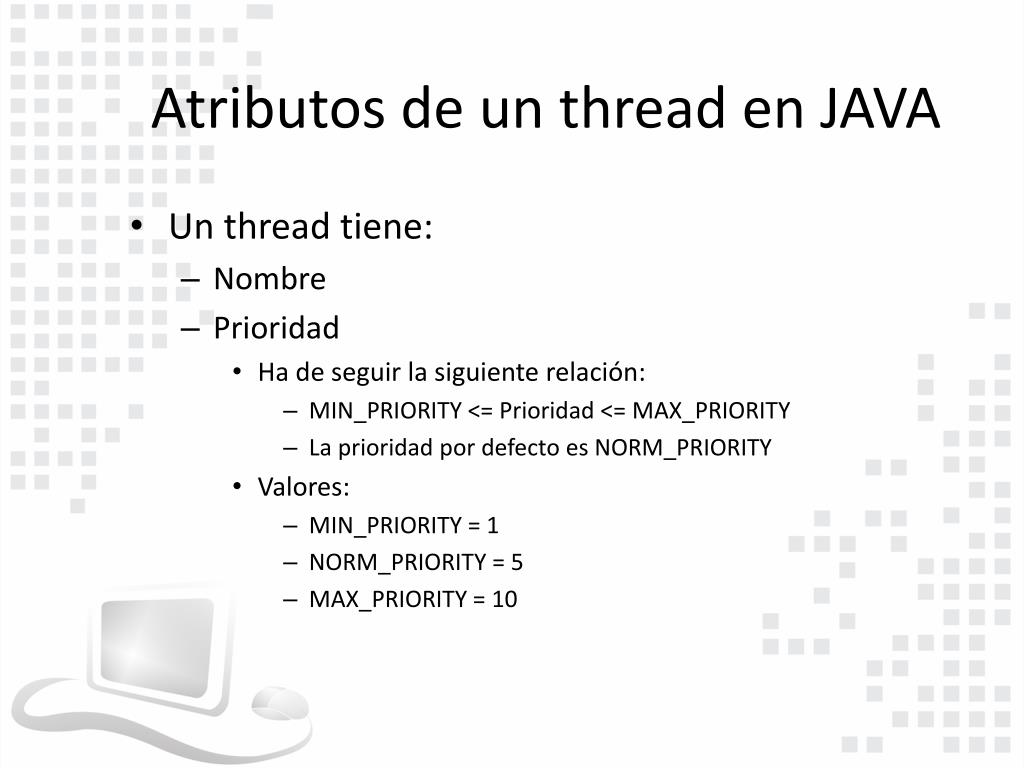 Atributos de un thread en JAVA • Un thread tiene: • Nombre • Prioridad • Ha de seguir la siguiente relación: • MIN_PRIORITY <= Prioridad <= MAX_PRIORITY • La prioridad por defecto es NORM_PRIORITY • Valores: • MIN_PRIORITY = 1 • NORM_PRIORITY = 5 • MAX_PRIORITY = 10