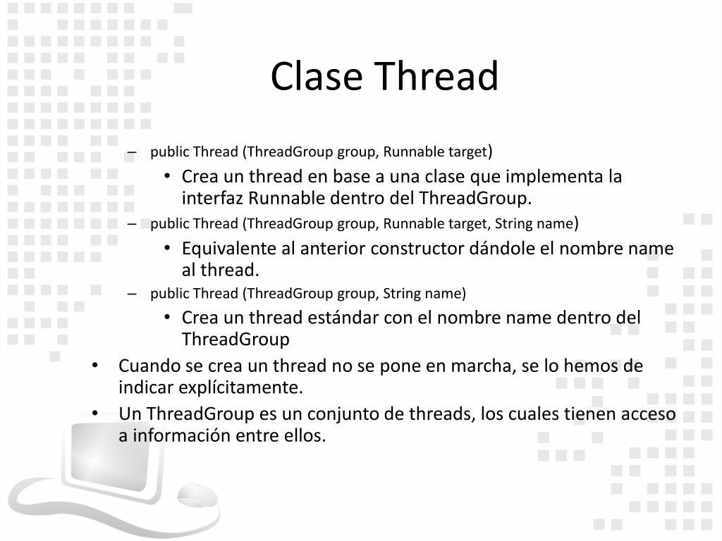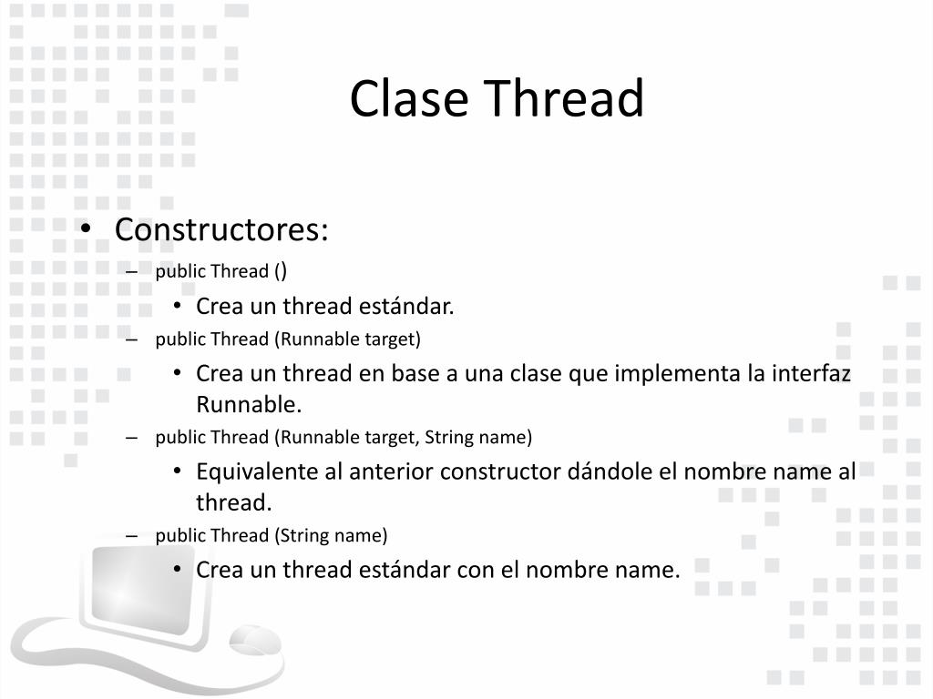Clase Thread • Constructores: • public Thread () • Crea un thread estándar. • public Thread (Runnable target) • Crea un thread en base a una clase que implementa la interfaz Runnable. • public Thread (Runnable target, String name) • Equivalente al anterior constructor dándole el nombre name al thread. • public Thread (String name) • Crea un thread estándar con el nombre name.