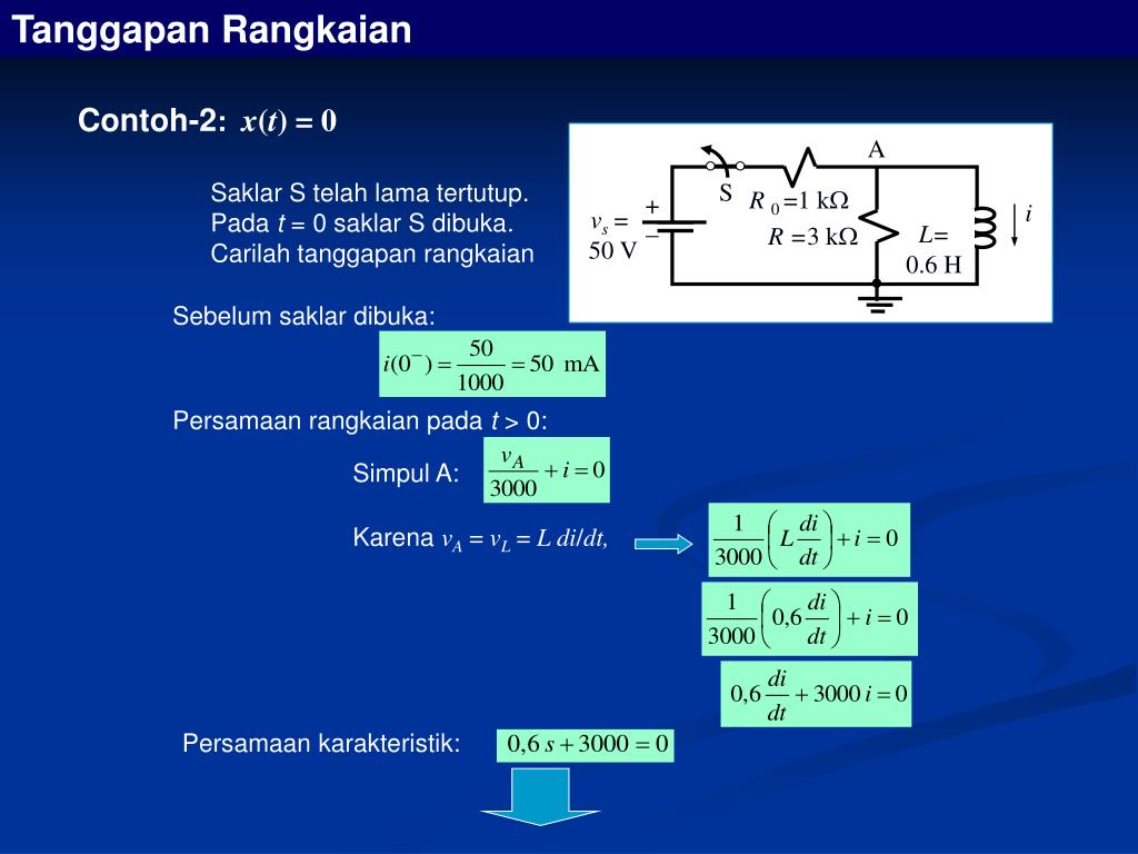 Tanggapan Rangkaian A R 0 =1 k i + vs = 50 V L= 0.6 H R =3 k S Contoh-2: x(t) = 0 Saklar S telah lama tertutup. Pada t = 0 saklar S dibuka. Carilah tanggapan rangkaian Sebelum saklar dibuka: Persamaan rangkaian pada t > 0: Simpul A: Karena vA = vL= L di/dt, Persamaan karakteristik: