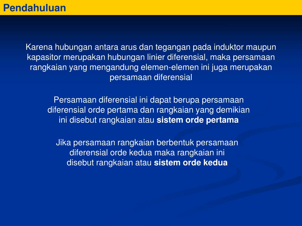Pendahuluan Karena hubungan antara arus dan tegangan pada induktor maupun kapasitor merupakan hubungan linier diferensial, maka persamaan rangkaian yang mengandung elemen-elemen ini juga merupakan persamaan diferensial Persamaan diferensial ini dapat berupa persamaan diferensial orde pertama dan rangkaian yang demikian ini disebut rangkaian atau sistem orde pertama Jika persamaan rangkaian berbentuk persamaan diferensial orde kedua maka rangkaian ini disebut rangkaian atau sistem orde kedua