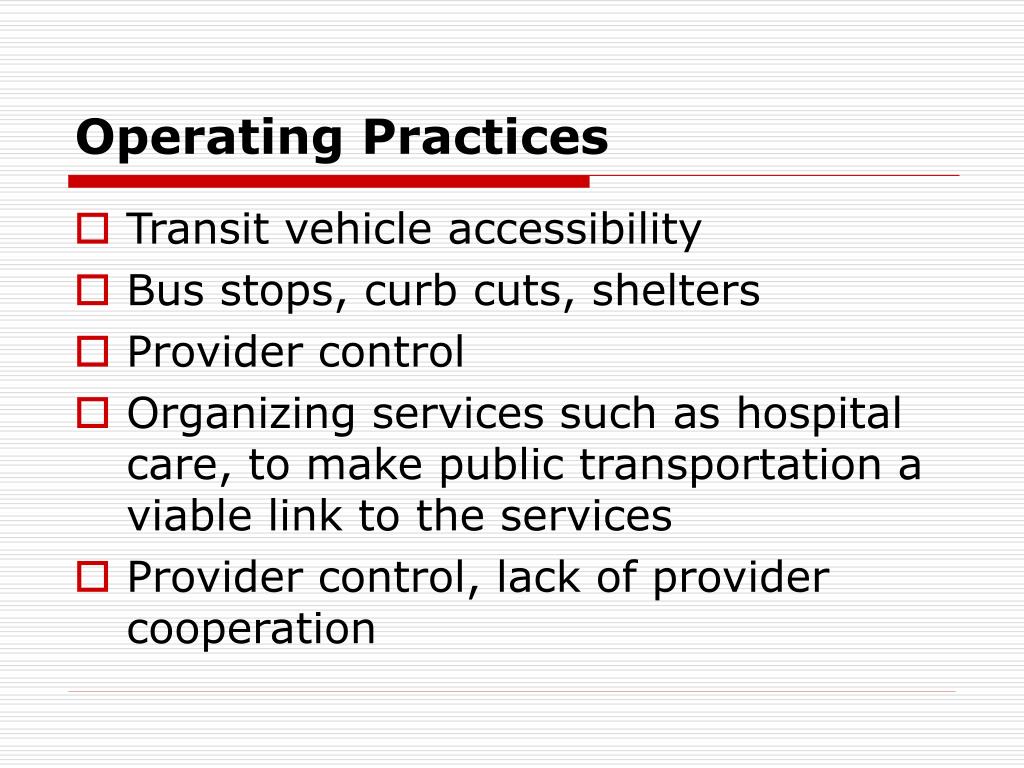 Operating Practices • Transit vehicle accessibility • Bus stops, curb cuts, shelters • Provider control • Organizing services such as hospital care, to make public transportation a viable link to the services • Provider control, lack of provider cooperation