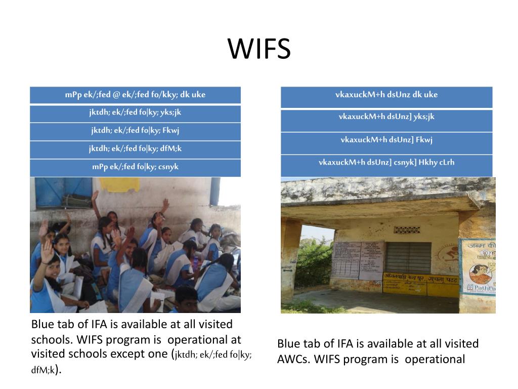 WIFS Blue tab of IFA is available at all visited schools. WIFS program is operational at visited schools except one (jktdh; ek/;fed fo|ky; dfM;k). Blue tab of IFA is available at all visited AWCs. WIFS program is operational