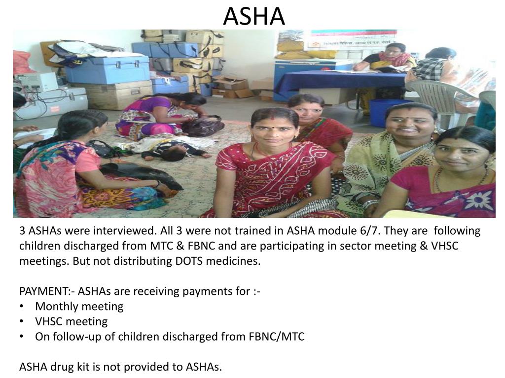 ASHA • 3 ASHAs were interviewed. All 3 were not trained in ASHA module 6/7. They are following children discharged from MTC & FBNC and are participating in sector meeting & VHSC meetings. But not distributing DOTS medicines. • PAYMENT:- ASHAs are receiving payments for :- • Monthly meeting • VHSC meeting • On follow-up of children discharged from FBNC/MTC • ASHA drug kit is not provided to ASHAs.