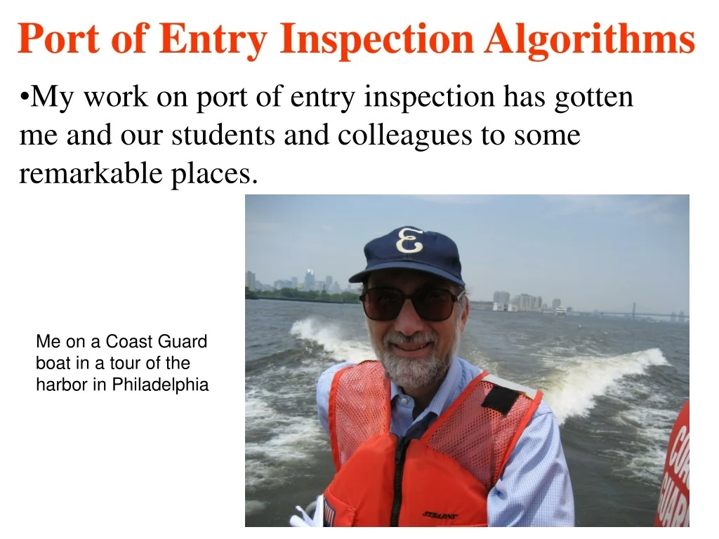 My work on port of entry inspection has gotten me and our students and colleagues to some remarkable places. Port of Entry Inspection Algorithms Me on a Coast Guard boat in a tour of the harbor in Philadelphia