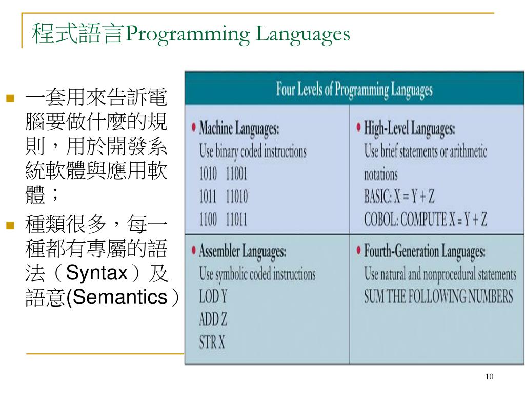 程式語言Programming Languages • 一套用來告訴電腦要做什麼的規則,用於開發系統軟體與應用軟體; • 種類很多,每一種都有專屬的語法(Syntax)及語意(Semantics)