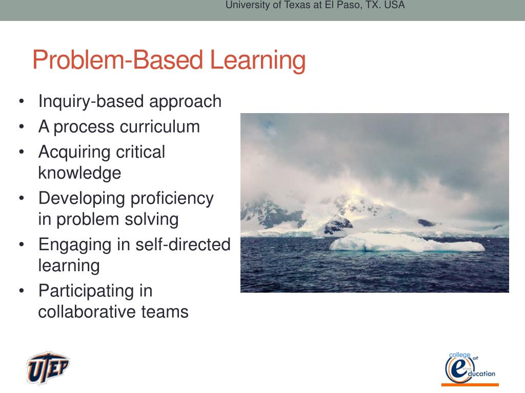 University of Texas at El Paso, TX. USA Problem-Based Learning • Inquiry-based approach • A process curriculum • Acquiring critical knowledge • Developing proficiency in problem solving • Engaging in self-directed learning • Participating in collaborative teams