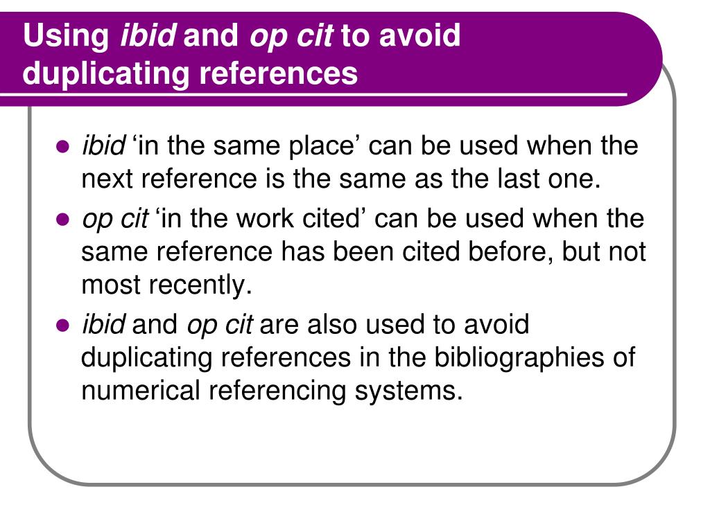 Using ibid and op cit to avoid duplicating references • ibid ‘in the same place’ can be used when the next reference is the same as the last one. • op cit ‘in the work cited’ can be used when the same reference has been cited before, but not most recently. • ibid and op cit are also used to avoid duplicating references in the bibliographies of numerical referencing systems.