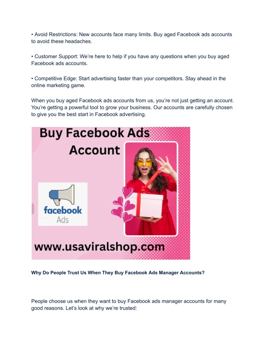 accounts, you’re not just spending money – you’re investing in your business’s growth. Please contact 24-hour any time https://usaviralshop.com/product/buy-facebook-ads-accounts/ Email: usaviralshop40@gmail.com Telegram: @usaviralshop Skype: usaviralshop WhatsApp: +1 (862) 413-0638 Buy Facebook Ads Accounts Are you running an online business? If so, you know how crucial it is to reach more customers. That’s where Facebook Ads come in. But what if you could skip the long wait and start advertising right away? This is why many businesses choose to buy Facebook Ads accounts. When you buy Facebook Ads accounts, you get a head start. These accounts are ready to use, saving you time and effort. You don’t have to worry about account creation or approval processes. Instead, you can focus on what matters most – growing your business. Facebook has billions of users. By using ads, you can reach the right people who might like your products or services. But sometimes, new accounts face limits or get blocked. When you buy Facebook Ads accounts, you get accounts that are already trusted by Facebook. This means you can run your ads without worrying about sudden stops. Another big plus when you buy Facebook Ads accounts is the spending limit. New accounts often have low limits, which can slow down your marketing plans. Purchased accounts usually come with higher limits, letting you scale your ads faster. For small businesses or those just starting with online marketing, buying Facebook Ads accounts can be a game-changer. It lets you compete with bigger companies right from the start. You can test different ad strategies and find what works best for your business.