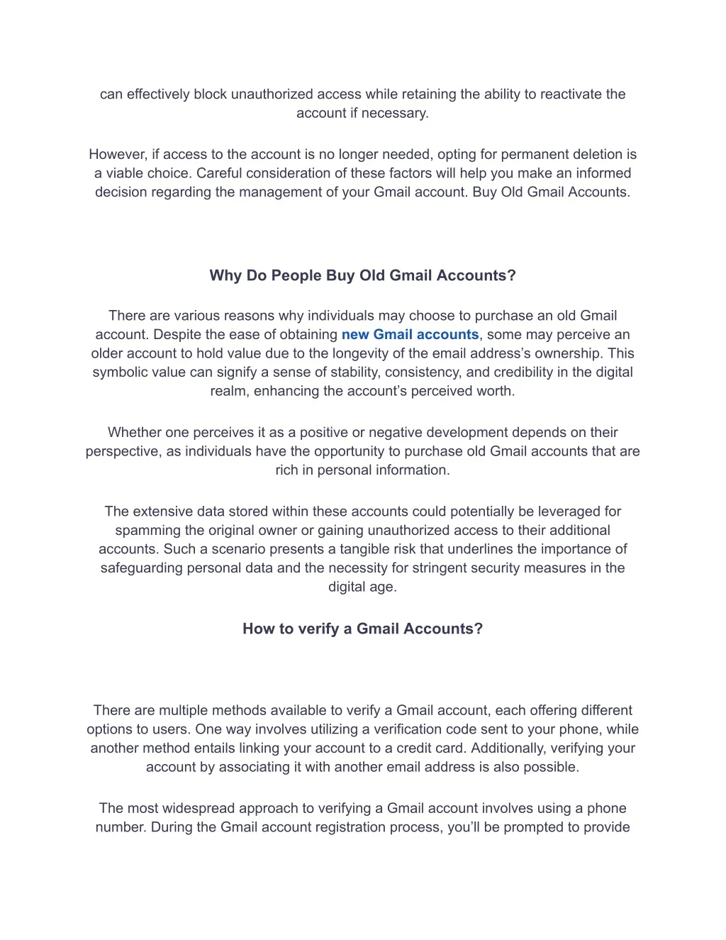 can effectively block unauthorized access while retaining the ability to reactivate the account if necessary. However, if access to the account is no longer needed, opting for permanent deletion is a viable choice. Careful consideration of these factors will help you make an informed decision regarding the management of your Gmail account. Buy Old Gmail Accounts. Why Do People Buy Old Gmail Accounts? There are various reasons why individuals may choose to purchase an old Gmail account. Despite the ease of obtaining new Gmail accounts, some may perceive an older account to hold value due to the longevity of the email address’s ownership. This symbolic value can signify a sense of stability, consistency, and credibility in the digital realm, enhancing the account’s perceived worth. Whether one perceives it as a positive or negative development depends on their perspective, as individuals have the opportunity to purchase old Gmail accounts that are rich in personal information. The extensive data stored within these accounts could potentially be leveraged for spamming the original owner or gaining unauthorized access to their additional accounts. Such a scenario presents a tangible risk that underlines the importance of safeguarding personal data and the necessity for stringent security measures in the digital age. How to verify a Gmail Accounts? There are multiple methods available to verify a Gmail account, each offering different options to users. One way involves utilizing a verification code sent to your phone, while another method entails linking your account to a credit card. Additionally, verifying your account by associating it with another email address is also possible. The most widespread approach to verifying a Gmail account involves using a phone number. During the Gmail account registration process, you’ll be prompted to provide