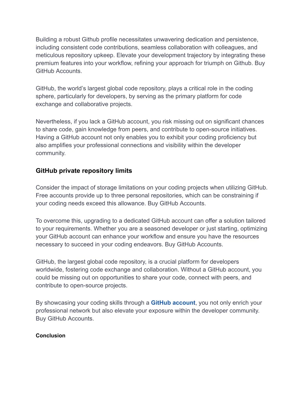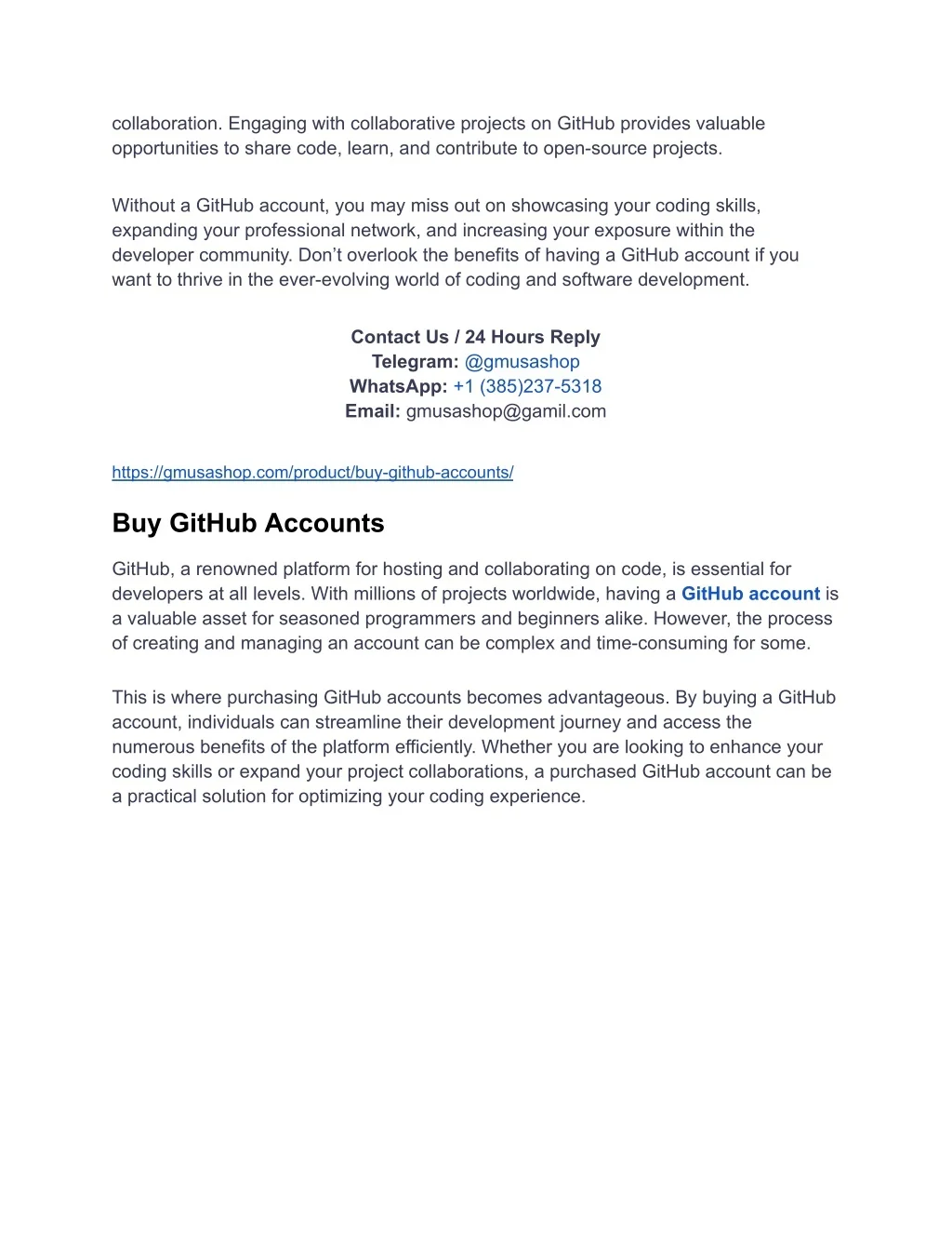 collaboration. Engaging with collaborative projects on GitHub provides valuable opportunities to share code, learn, and contribute to open-source projects. Without a GitHub account, you may miss out on showcasing your coding skills, expanding your professional network, and increasing your exposure within the developer community. Don’t overlook the benefits of having a GitHub account if you want to thrive in the ever-evolving world of coding and software development. Contact Us / 24 Hours Reply Telegram: @gmusashop WhatsApp: +1 (385)237-5318 Email: gmusashop@gamil.com https://gmusashop.com/product/buy-github-accounts/ Buy GitHub Accounts GitHub, a renowned platform for hosting and collaborating on code, is essential for developers at all levels. With millions of projects worldwide, having a GitHub account is a valuable asset for seasoned programmers and beginners alike. However, the process of creating and managing an account can be complex and time-consuming for some. This is where purchasing GitHub accounts becomes advantageous. By buying a GitHub account, individuals can streamline their development journey and access the numerous benefits of the platform efficiently. Whether you are looking to enhance your coding skills or expand your project collaborations, a purchased GitHub account can be a practical solution for optimizing your coding experience.