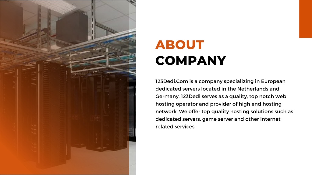 ABOUT COMPANY 123Dedi.Com is a company specializing in European dedicated servers located in the Netherlands and Germany. 123Dedi serves as a quality, top notch web hosting operator and provider of high end hosting network. We offer top quality hosting solutions such as dedicated servers, game server and other internet related services.
