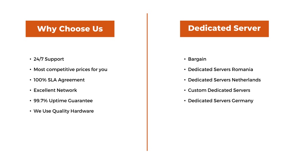 Dedicated Server Why Choose Us • 24/7 Support • Most competitive prices for you • 100% SLA Agreement • Excellent Network • 99.7% Uptime Guarantee • We Use Quality Hardware • Bargain • Dedicated Servers Romania • Dedicated Servers Netherlands • Custom Dedicated Servers • Dedicated Servers Germany