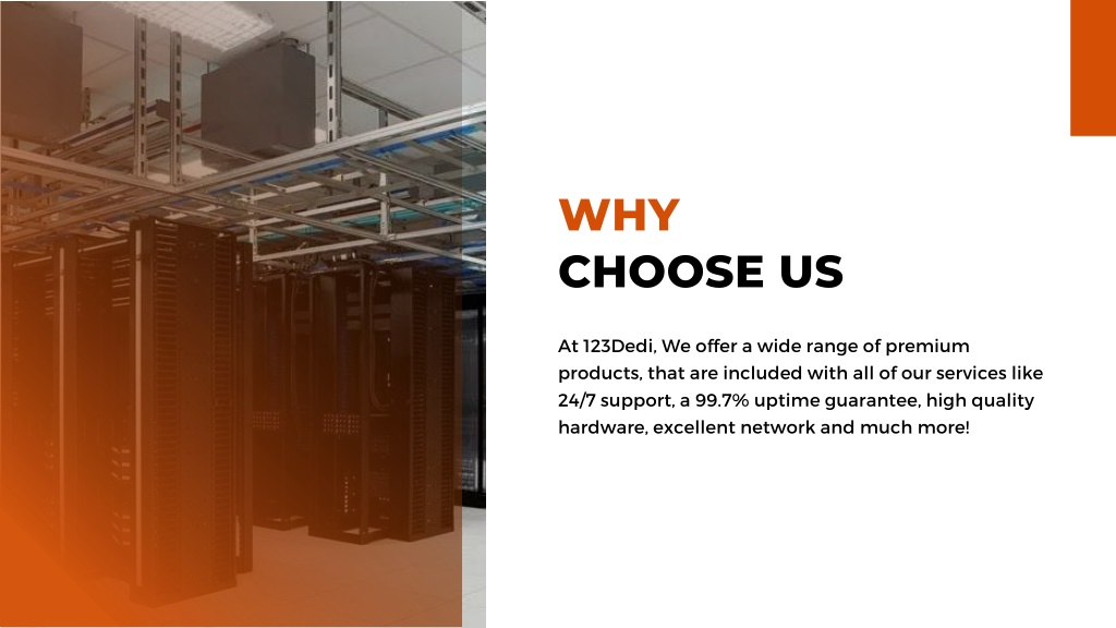 WHY CHOOSE US At 123Dedi, We offer a wide range of premium products, that are included with all of our services like 24/7 support, a 99.7% uptime guarantee, high quality hardware, excellent network and much more!