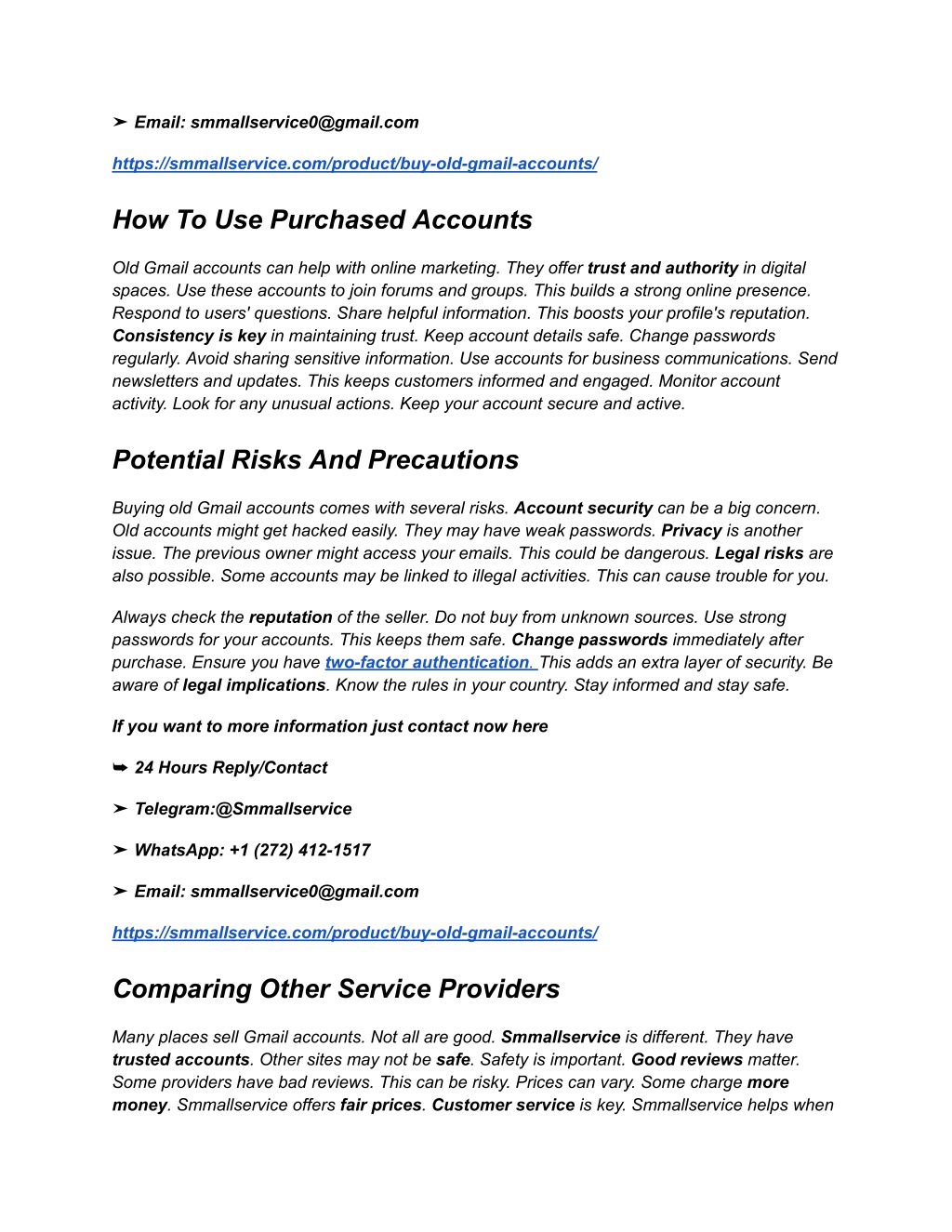 ➤ Email: smmallservice0@gmail.com https://smmallservice.com/product/buy-old-gmail-accounts/ How To Use Purchased Accounts Old Gmail accounts can help with online marketing. They offer trust and authority in digital spaces. Use these accounts to join forums and groups. This builds a strong online presence. Respond to users' questions. Share helpful information. This boosts your profile's reputation. Consistency is key in maintaining trust. Keep account details safe. Change passwords regularly. Avoid sharing sensitive information. Use accounts for business communications. Send newsletters and updates. This keeps customers informed and engaged. Monitor account activity. Look for any unusual actions. Keep your account secure and active. Potential Risks And Precautions Buying old Gmail accounts comes with several risks. Account security can be a big concern. Old accounts might get hacked easily. They may have weak passwords. Privacy is another issue. The previous owner might access your emails. This could be dangerous. Legal risks are also possible. Some accounts may be linked to illegal activities. This can cause trouble for you. Always check the reputation of the seller. Do not buy from unknown sources. Use strong passwords for your accounts. This keeps them safe. Change passwords immediately after purchase. Ensure you have two-factor authentication. This adds an extra layer of security. Be aware of legal implications. Know the rules in your country. Stay informed and stay safe. If you want to more information just contact now here ➥ 24 Hours Reply/Contact ➤ Telegram:@Smmallservice ➤ WhatsApp: +1 (272) 412-1517 ➤ Email: smmallservice0@gmail.com https://smmallservice.com/product/buy-old-gmail-accounts/ Comparing Other Service Providers Many places sell Gmail accounts. Not all are good. Smmallservice is different. They have trusted accounts. Other sites may not be safe. Safety is important. Good reviews matter. Some providers have bad reviews. This can be risky. Prices can vary. Some charge more money. Smmallservice offers fair prices. Customer service is key. Smmallservice helps when