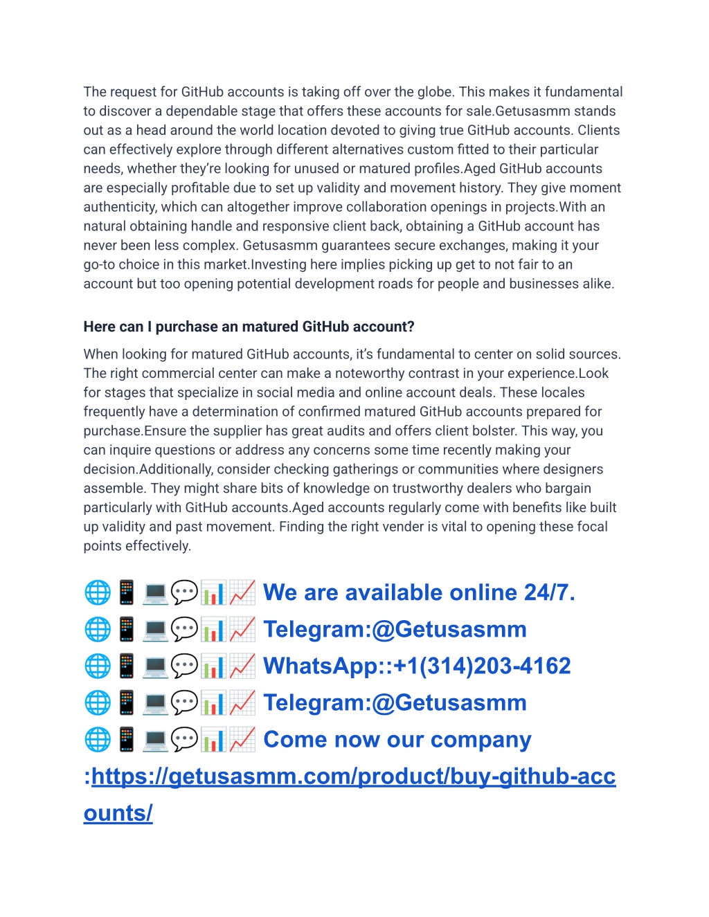 How do I rapidly purchase GitHub accounts? from getusasmm Purchasing GitHub accounts from getusasmm is a direct prepare. To begin with, visit their site to investigate different account choices available.Browse through the distinctive sorts of accounts recorded. You can discover both modern and matured alternatives custom-made to your needs. Each posting incorporates fundamental points of interest to offer assistance you make an educated decision.Once you’ve chosen the account that suits you best, press on it for more data. Include it to your cart and continue to checkout. The installment strategies are user-friendly and secure, guaranteeing your exchange is safe.After completing the buy, you’ll get your login accreditations expeditiously through mail. This speedy conveyance permits you quick get to to begin utilizing GitHub for your ventures without delay.With fair a few clicks, you’re prepared to improve your improvement travel with a solid GitHub account from getusasmm! Conclusion ?????? We are available online 24/7. ?????? Telegram:@Getusasmm ?????? WhatsApp::+1(314)203-4162 ?????? Telegram:@Getusasmm ?????? Come now our company :https://getusasmm.com/product/buy-github-acc ounts/ Investing in GitHub accounts can be a game-changer for your trade. The potential to get to a broader group of onlookers and collaborate consistently with designers is immense.When you select to purchase from getusasmm, you’re not fair acquiring an account; you’re obtaining openings. Each account comes stuffed with highlights that can lift your projects.With our broad choice and dependable benefit, exploring the world of GitHub gets to be easy. You’ll discover what you require without the normal hassles related with online purchases.The prepare is direct. Fair visit our stage, investigate the alternatives, and make your choice. Your another huge venture is standing by on GitHub!Empower your advancement travel nowadays by leveraging quality accounts custom-made for development and victory.
