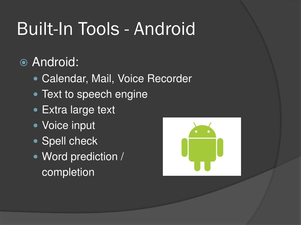Built-In Tools - Android • Android: • Calendar, Mail, Voice Recorder • Text to speech engine • Extra large text • Voice input • Spell check • Word prediction / completion