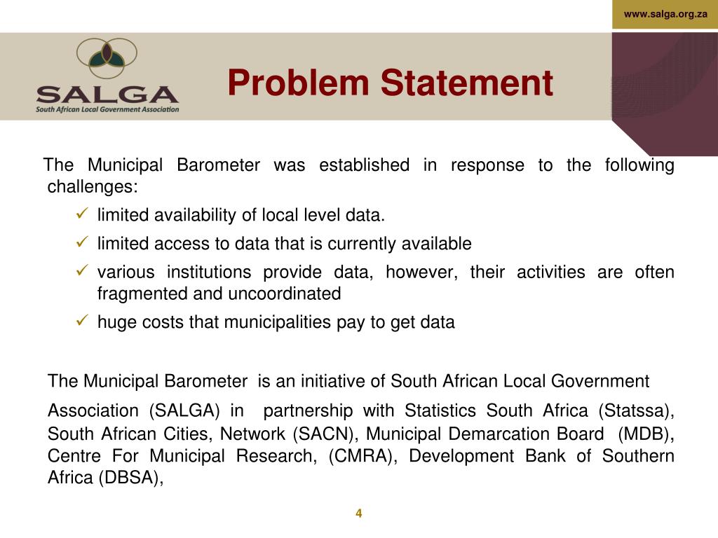 Problem Statement The Municipal Barometer was established in response to the following challenges: • limited availability of local level data. • limited access to data that is currently available • various institutions provide data, however, their activities are often fragmented and uncoordinated • huge costs that municipalities pay to get data The Municipal Barometer is an initiative of South African Local Government Association (SALGA) in partnership with Statistics South Africa (Statssa), South African Cities, Network (SACN), Municipal Demarcation Board (MDB), Centre For Municipal Research, (CMRA), Development Bank of Southern Africa (DBSA),