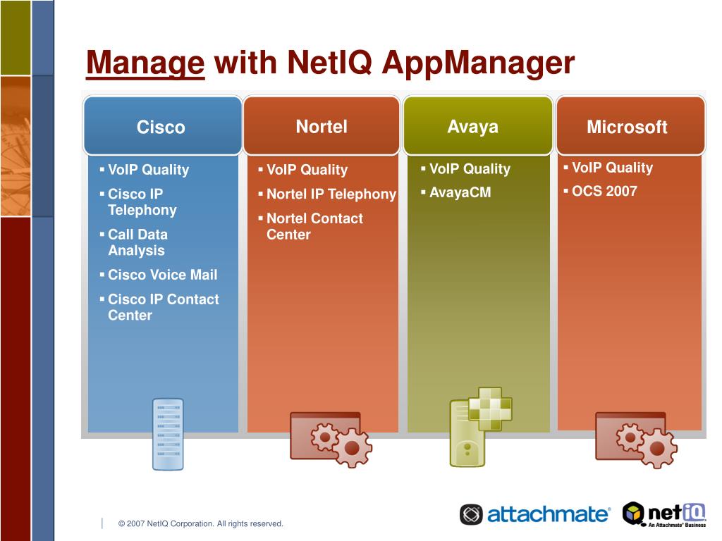 Manage with NetIQ AppManager Cisco Nortel Avaya Microsoft • VoIP Quality • OCS 2007 • VoIP Quality • Cisco IP Telephony • Call Data Analysis • Cisco Voice Mail • Cisco IP Contact Center • VoIP Quality • Nortel IP Telephony • Nortel Contact Center • VoIP Quality • AvayaCM