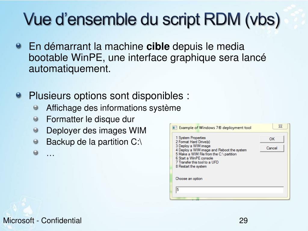 Microsoft - Confidential Vued’ensemble du script RDM (vbs) • En démarrant la machine cibledepuis le media bootable WinPE, une interface graphique sera lancéautomatiquement. • Plusieurs options sontdisponibles : • Affichage des informationssystème • Formatter le disquedur • Deployer des images WIM • Backup de la partition C:\ • …
