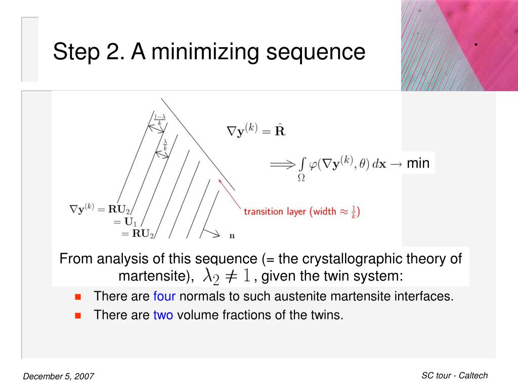 Step 2. A minimizing sequence min From analysis of this sequence (= the crystallographic theory of martensite), , given the twin system: • There are four normals to such austenite martensite interfaces. • There are two volume fractions of the twins.