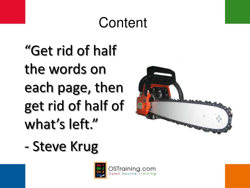 Content “Get rid of half the words on each page, then get rid of half of what’s left.” - Steve Krug