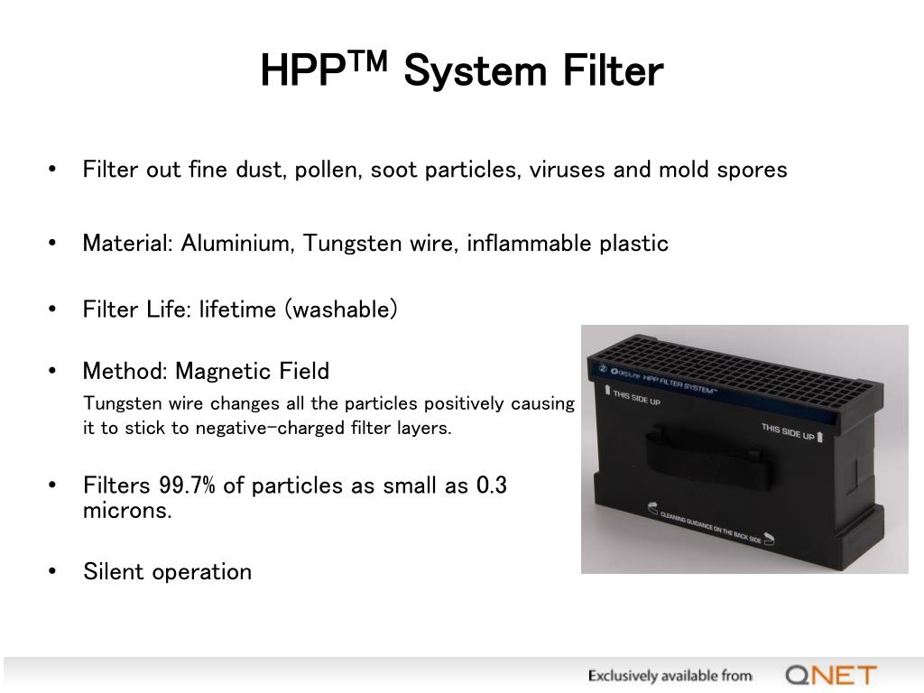 HPPTM System Filter • Filter out fine dust, pollen, soot particles, viruses and mold spores • Material: Aluminium, Tungsten wire, inflammable plastic • Filter Life: lifetime (washable) • Method: Magnetic Field Tungsten wire changes all the particles positively causing it to stick to negative-charged filter layers. • Filters 99.7% of particles as small as 0.3 microns. • Silent operation