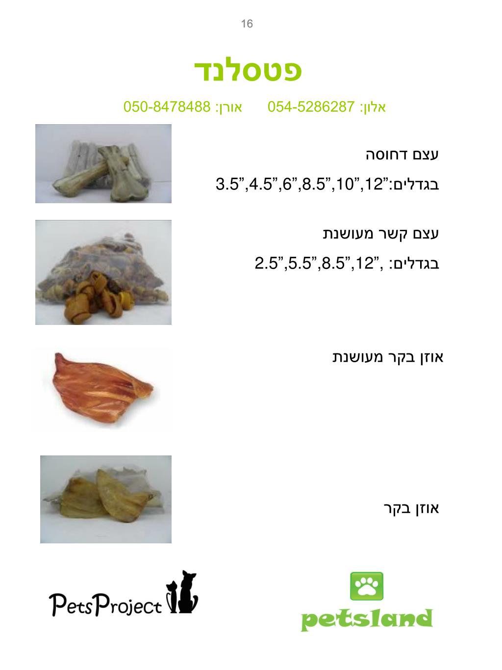 16 16 פטסלנד אלון: 054-5286287 אורן: 050-8478488 עצם דחוסה בגדלים:3.5”,4.5”,6”,8.5”,10”,12” עצם קשר מעושנת בגדלים: 2.5”,5.5”,8.5”,12”, אוזן בקר מעושנת אוזן בקר