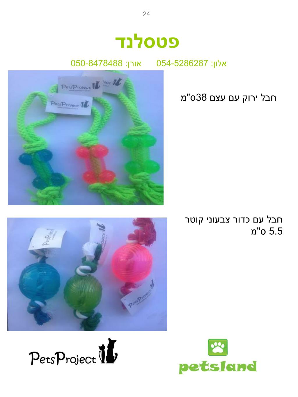 24 24 פטסלנד אלון: 054-5286287 אורן: 050-8478488 חבל ירוק עם עצם 38ס"מ חבל עם כדור צבעוני קוטר 5.5 ס"מ