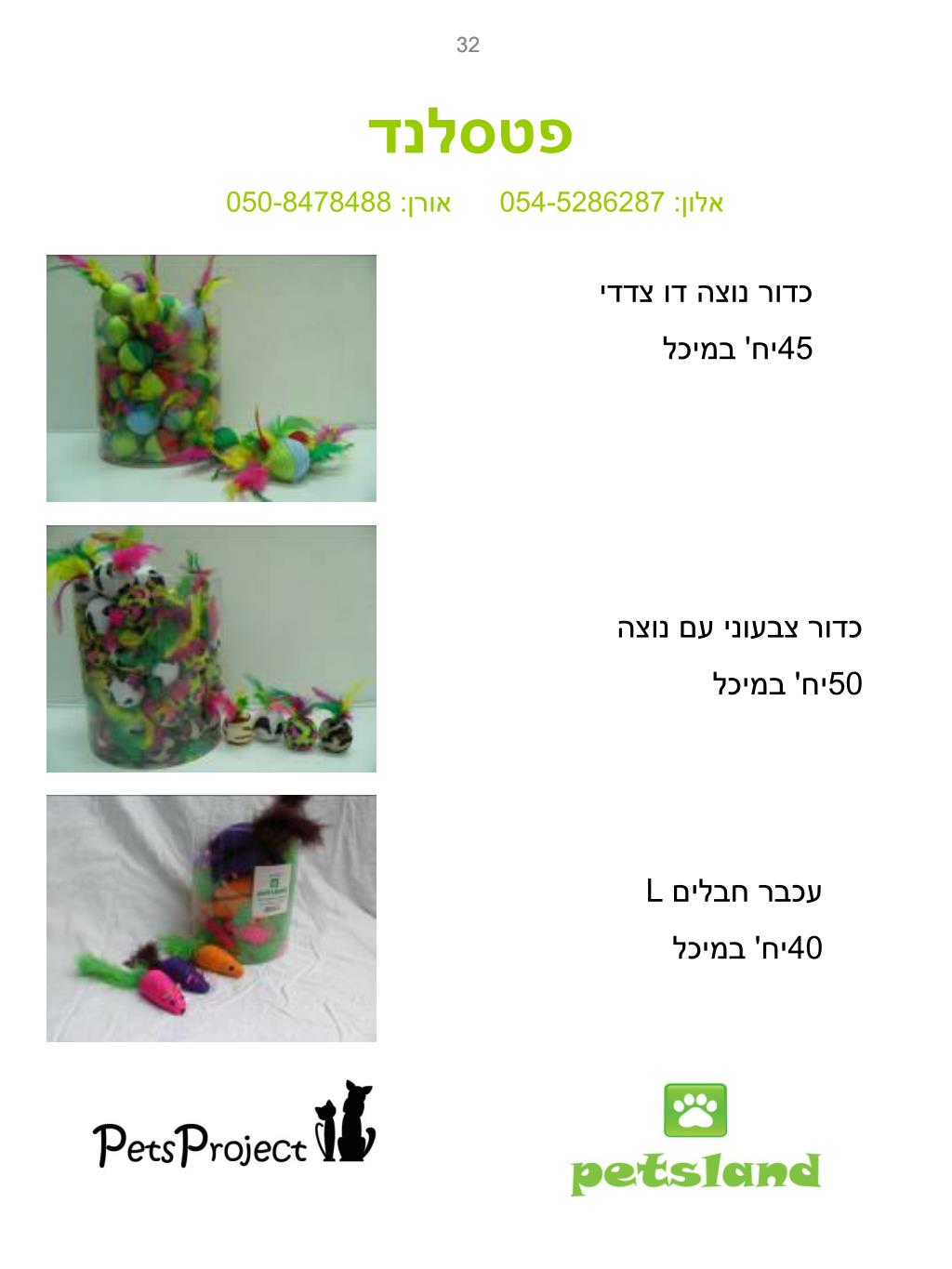 32 32 פטסלנד אלון: 054-5286287 אורן: 050-8478488 כדור נוצה דו צדדי 45יח' במיכל כדור צבעוני עם נוצה 50יח' במיכל עכבר חבלים L 40יח' במיכל