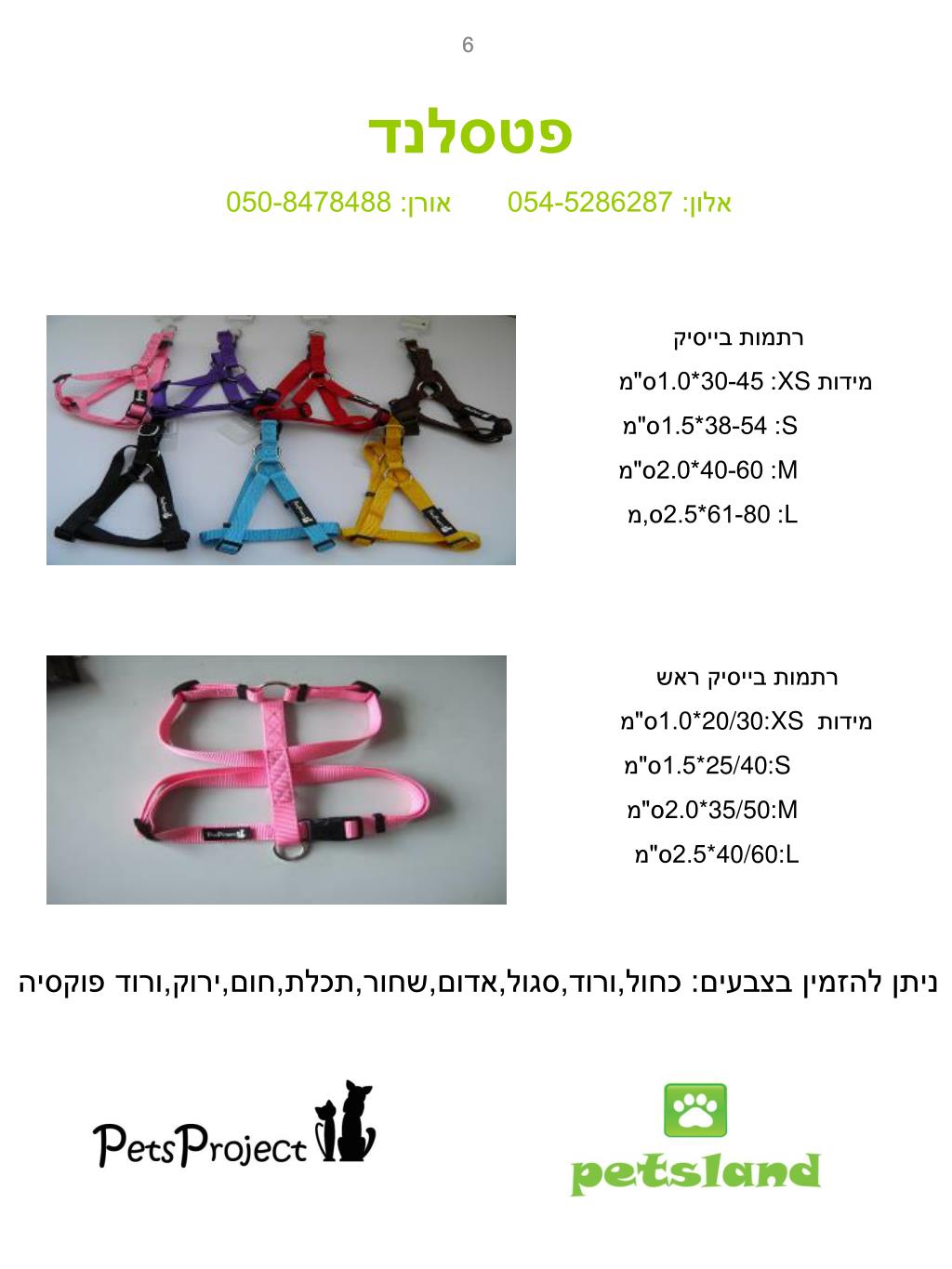 10 10 פטסלנד אלון: 054-5286287 אורן: 050-8478488 קולרי בד צבעונים ב-14 עיצובים שונים מידות: S: 1.5ס"מ M: 2.0ס"מ L: 2.5ס"מ רצועות בד צבעוניות ב-14 עיצובים שונים מידותS : 150ס"מ*1.5ס"מ M: 150ס"מ*2.0ס"מ L:150ס"מ*2.5ס"מ רתמות בד צבעוניות ב-14 עיצובים שונים מידות S: 38-54*1.5ס"מ M: 40-60*2.0ס"מ L: 61-80*2.5ס,מ רתמות רשת במידות: XS,S,M,L,XL,XXL בצבעים:שחור, צבאי,ורוד,אדום,כחול,מנומר,כתום,סגול,שחור
