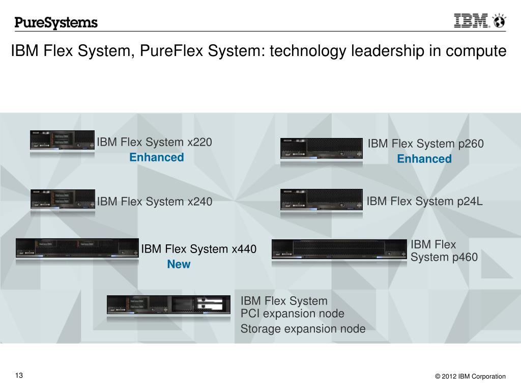 IBM Flex System, PureFlex System: technology leadership in compute IBM Flex System x220 Enhanced IBM Flex System p260 Enhanced IBM Flex System p24L IBM Flex System x240 IBM Flex System p460 IBM Flex System x440 New IBM Flex System PCI expansion node Storage expansion node
