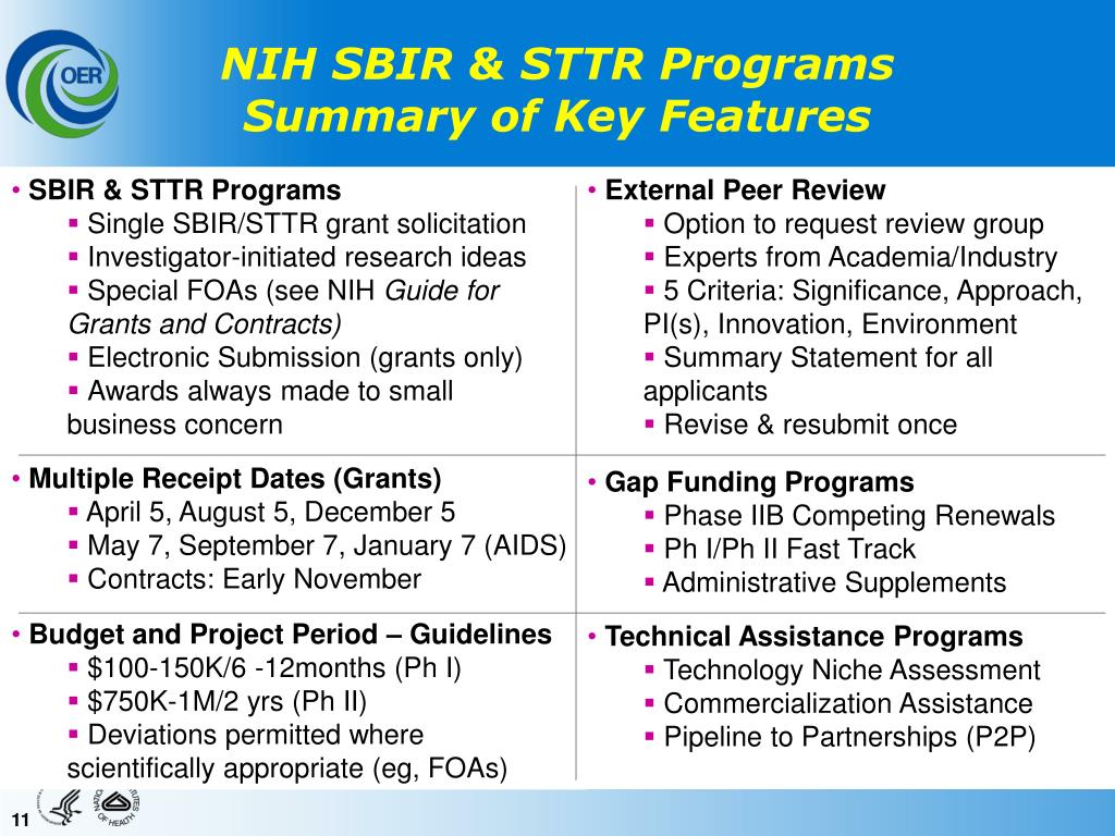 NIH SBIR & STTR Programs Summary of Key Features • SBIR & STTR Programs • Single SBIR/STTR grant solicitation • Investigator-initiated research ideas • Special FOAs (see NIH Guide for Grants and Contracts) • Electronic Submission (grants only) • Awards always made to small business concern • External Peer Review • Option to request review group • Experts from Academia/Industry • 5 Criteria: Significance, Approach, PI(s), Innovation, Environment • Summary Statement for all applicants • Revise & resubmit once • Multiple Receipt Dates (Grants) • April 5, August 5, December 5 • May 7, September 7, January 7 (AIDS) • Contracts: Early November • Gap Funding Programs • Phase IIB Competing Renewals • Ph I/Ph II Fast Track • Administrative Supplements • Budget and Project Period – Guidelines • $100-150K/6 -12months (Ph I) • $750K-1M/2 yrs (Ph II) • Deviations permitted where scientifically appropriate (eg, FOAs) • Technical Assistance Programs • Technology Niche Assessment • Commercialization Assistance • Pipeline to Partnerships (P2P)