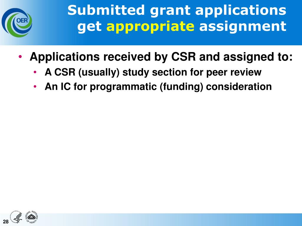 Submitted grant applications get appropriate assignment • Applications received by CSR and assigned to: • A CSR (usually) study section for peer review • An IC for programmatic (funding) consideration