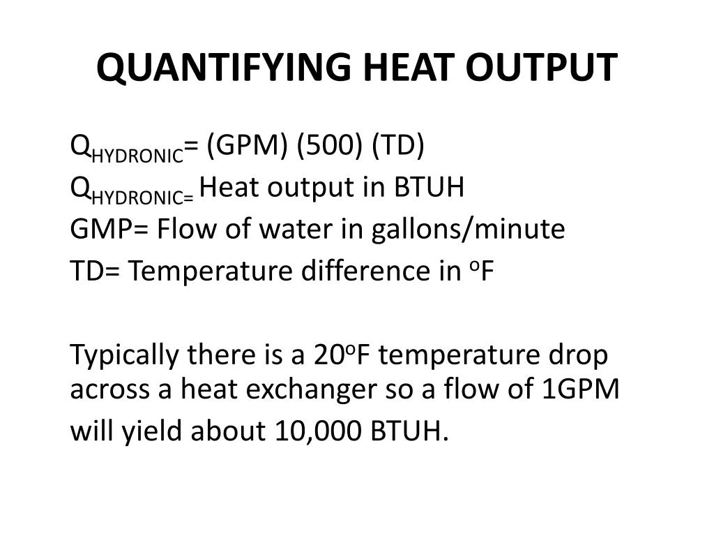 QUANTIFYING HEAT OUTPUT QHYDRONIC= (GPM) (500) (TD) QHYDRONIC= Heat output in BTUH GMP= Flow of water in gallons/minute TD= Temperature difference in oF Typically there is a 20oF temperature drop across a heat exchanger so a flow of 1GPM will yield about 10,000 BTUH.