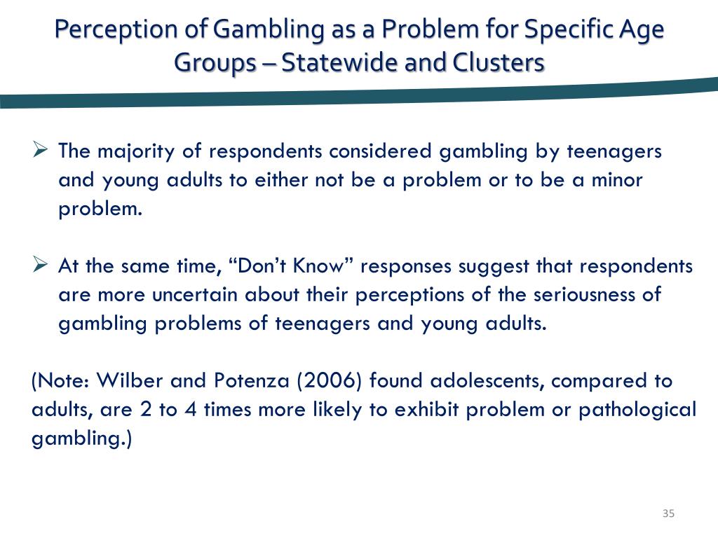 Perception of Gambling as a Problem for Specific Age Groups – Statewide and Clusters • The majority of respondents considered gambling by teenagers and young adults to either not be a problem or to be a minor problem. • At the same time, “Don’t Know” responses suggest that respondents are more uncertain about their perceptions of the seriousness of gambling problems of teenagers and young adults. (Note: Wilber and Potenza (2006) found adolescents, compared to adults, are 2 to 4 times more likely to exhibit problem or pathological gambling.)
